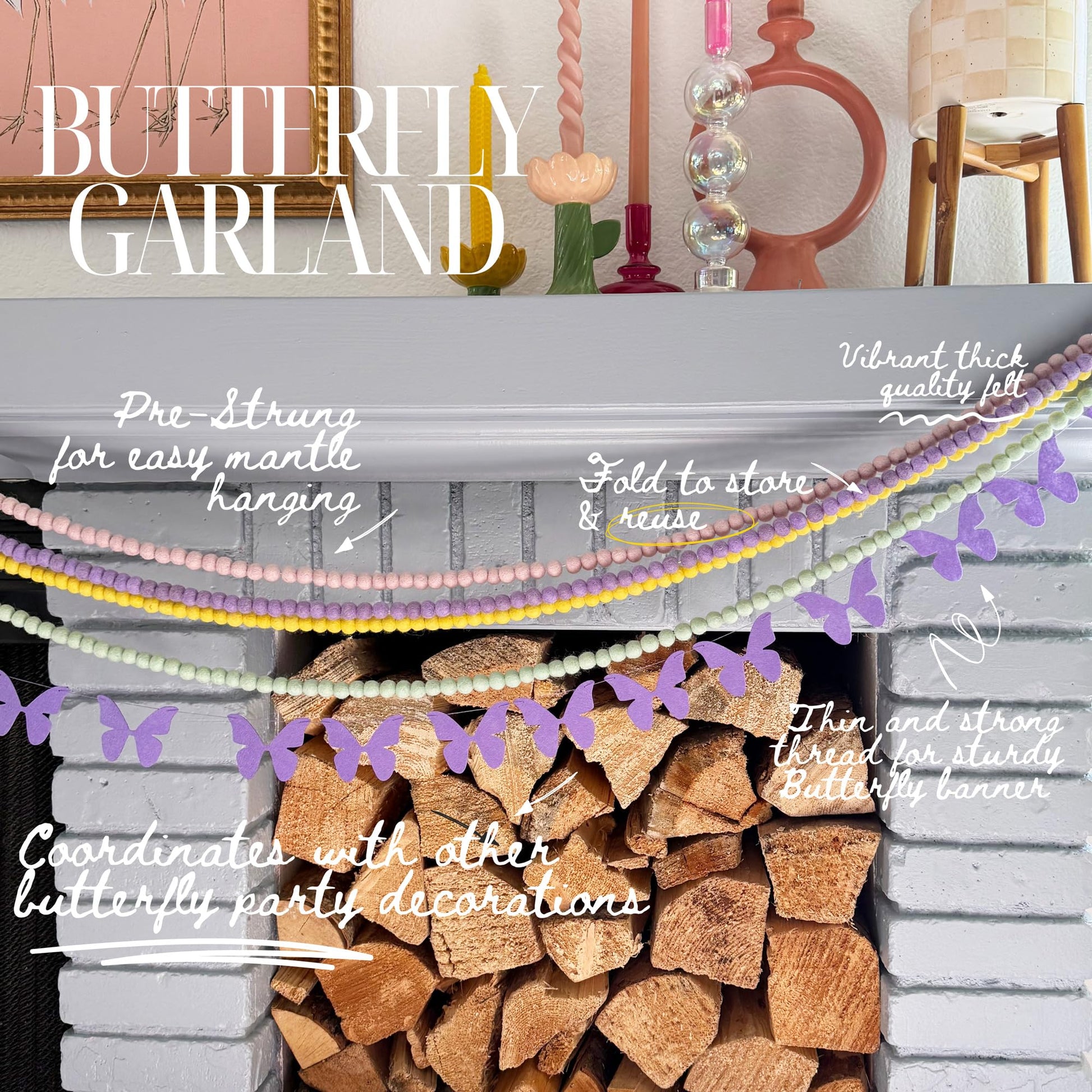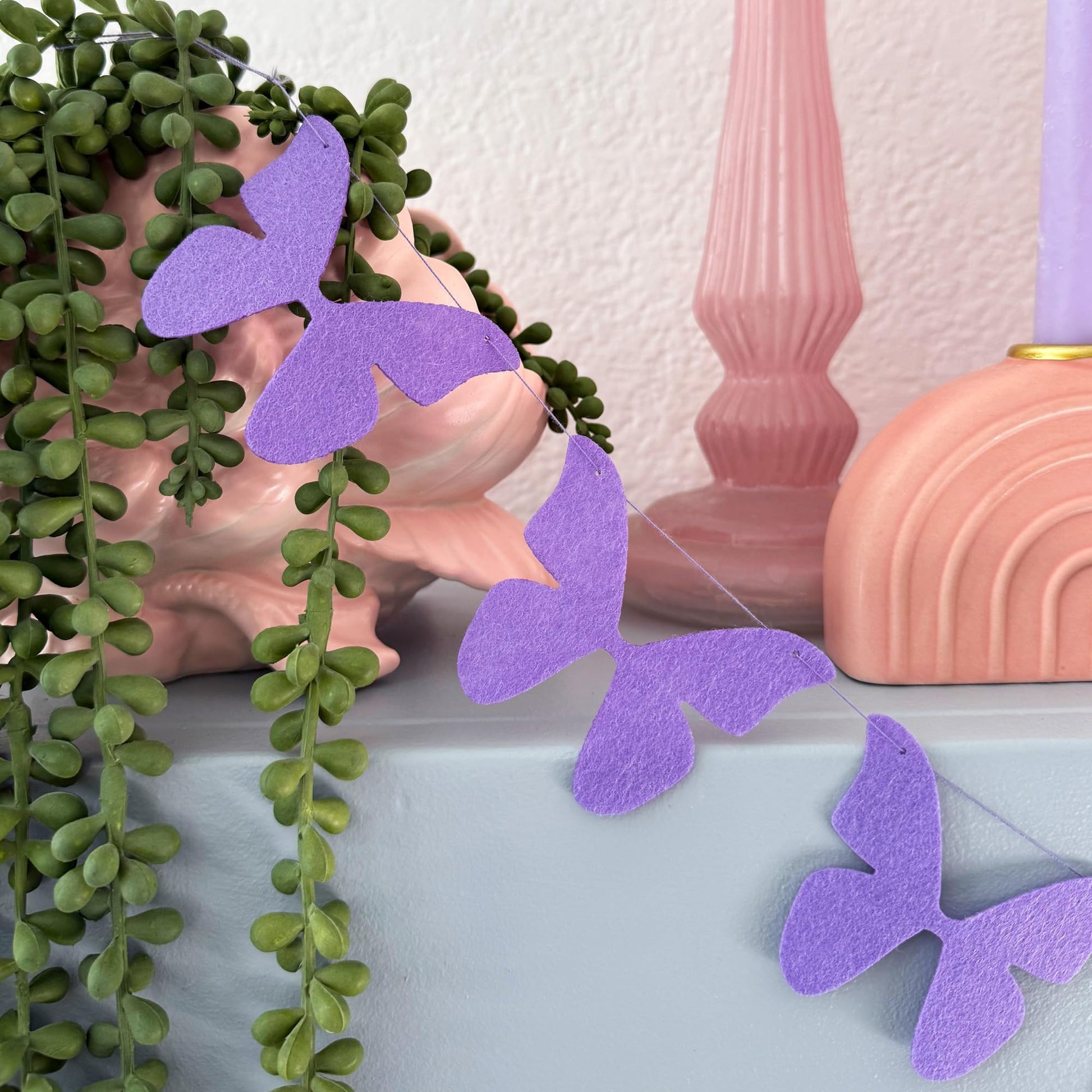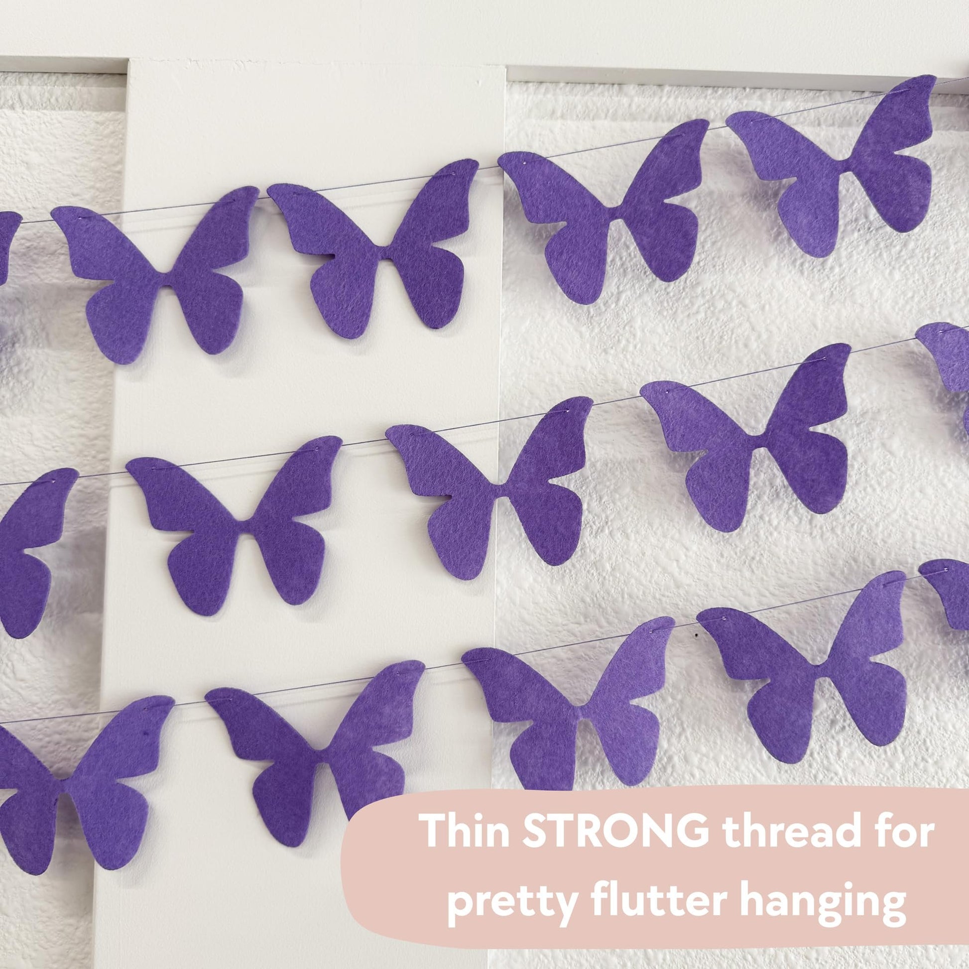 - Prestrung Butterfly Banner. Butterfly party decorations 2 by 3 inch small felt butterfly garland decorations that are prestrung for easy purple butterfly party decorations.