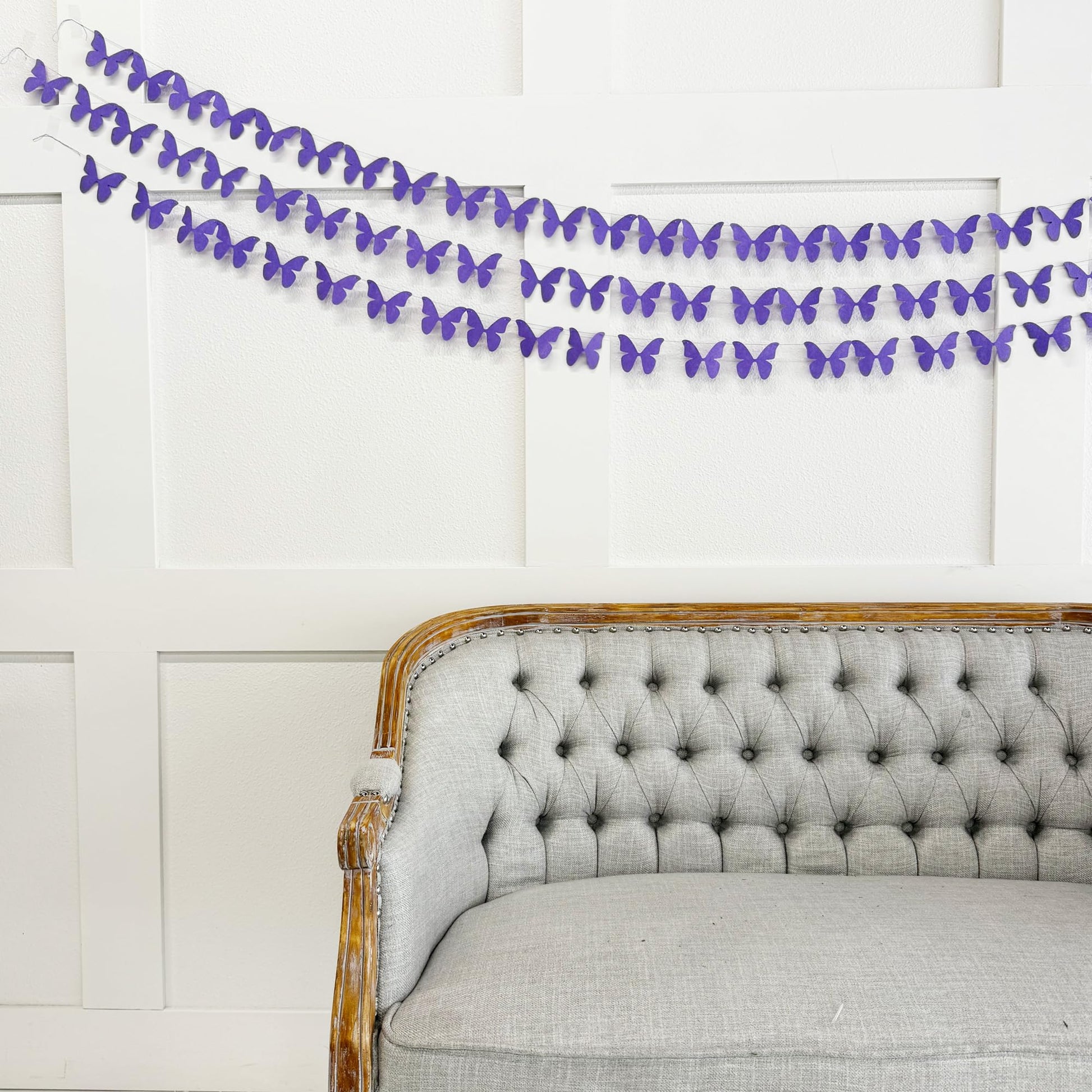 - Reusable hanging butterfly garland. Hang these purple butterfly decorations from any wall or ceiling to create a decorative room style you can use year after year for birthdays, bridal showers, and wedding decor.