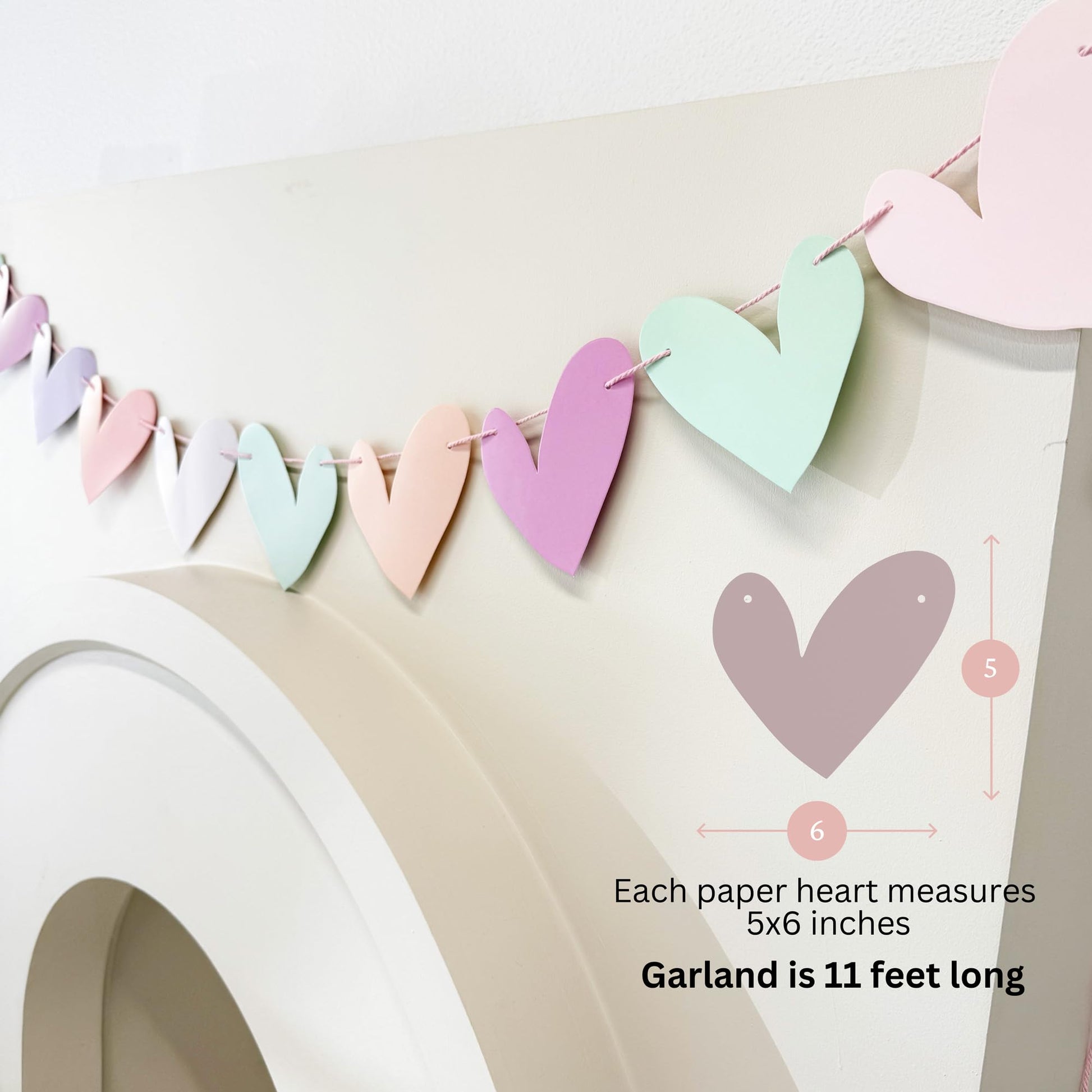 - Ready To Hang Paper Heart Garland- Prestrung Heart String Garland for home and heart theme party decor. Garland is 11 ft Long, each paper heart is 5x6 inches.